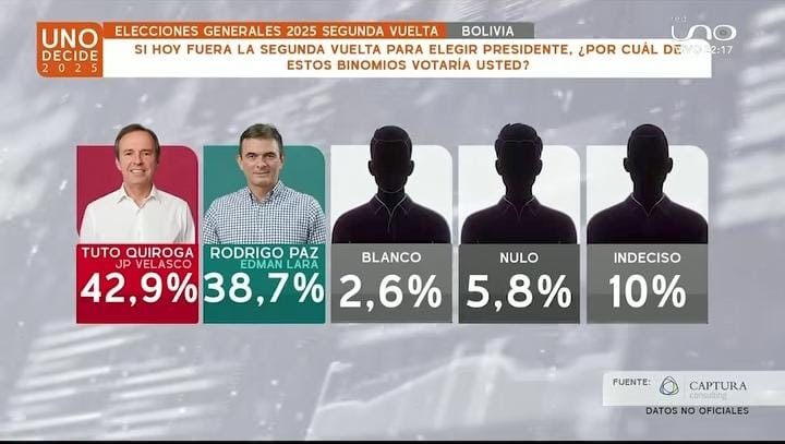 Leer másUna encuesta de la consultora Captura Consulting, difundida por la RED UNO, presenta un posible escenario para una segunda vuelta