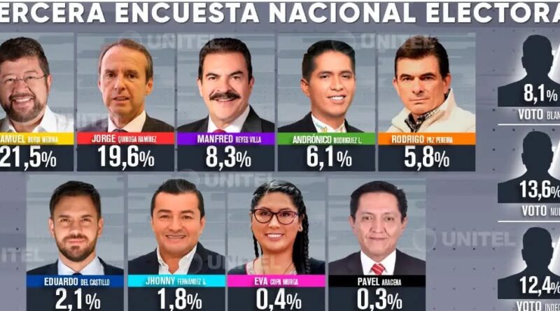 Samuel Doria Medina (alianza Unidad) con un 21,5% y Jorge Tuto Quiroga (alianza Libre) con el 19,6% encabezan la tercera encuesta nacional de intención de voto realizada por Ipsos CIESMORI, presentada este miércoles 30 de julio en el programa Así Decidimos de UNITEL.