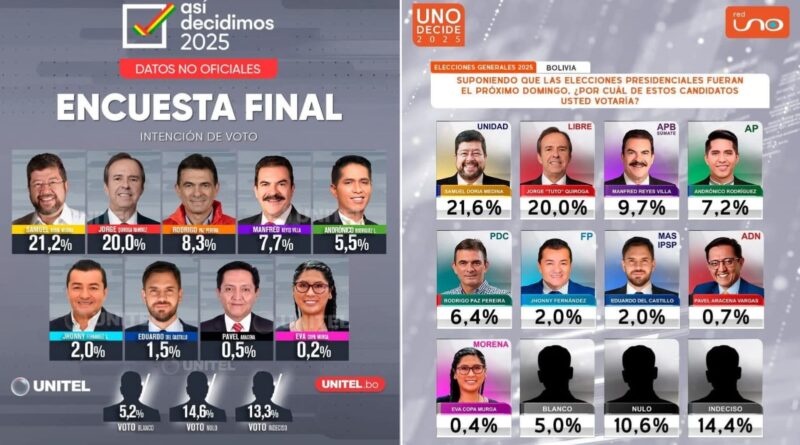 Éste domingo se difundio dos últimos resultados de intención de voto por la Red Uno de Bolivia y la Red Unitel.